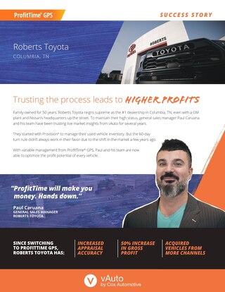 Family-owned for 50 years, Roberts Toyota reigns supreme as the #1 dealership in Columbia, TN, even with a GM plant and Nissan’s headquarters up the street. See how General Sales Manager, Paul Caruana, and his team use vAuto’s ProfitTime GPS to stay ahead of the competition.